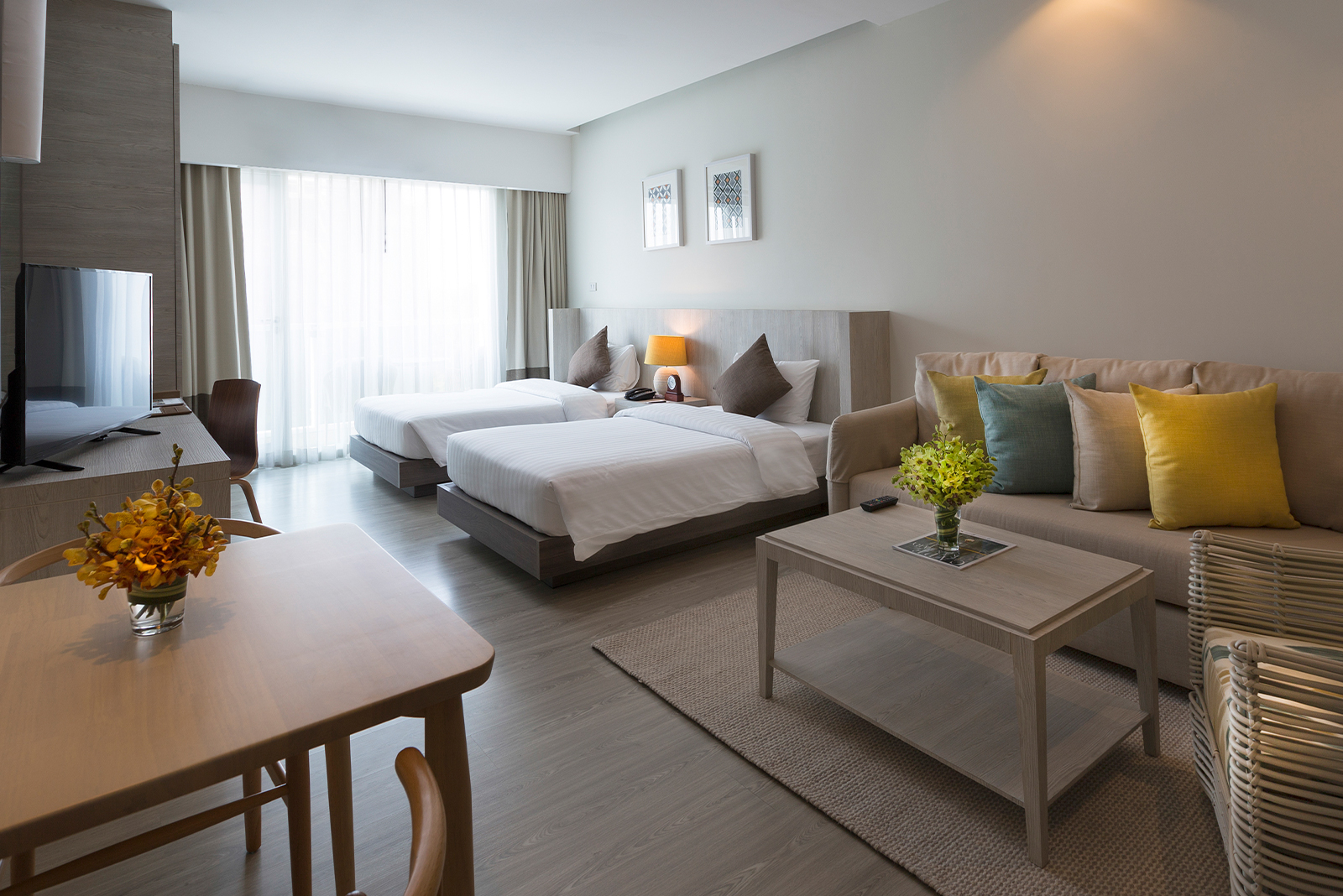 酒店提供开放式套房、宽敞的一卧套房和面积为103至115平方米的两卧套房供选择,所有以现代亚洲风格为设计理念,与自然美景融为一体,且客房都宽敞舒适。无论是短期停留还是长期居住,都能感受到无边舒适和便利。